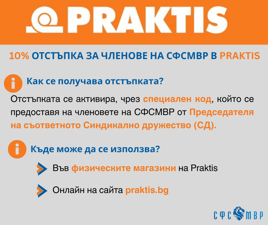 СФСМВР и веригата хипермаркети PRAKTIS предоставят възможност на членовете на синдиката да пазаруват с 10% отстъпка в магазините на веригата.